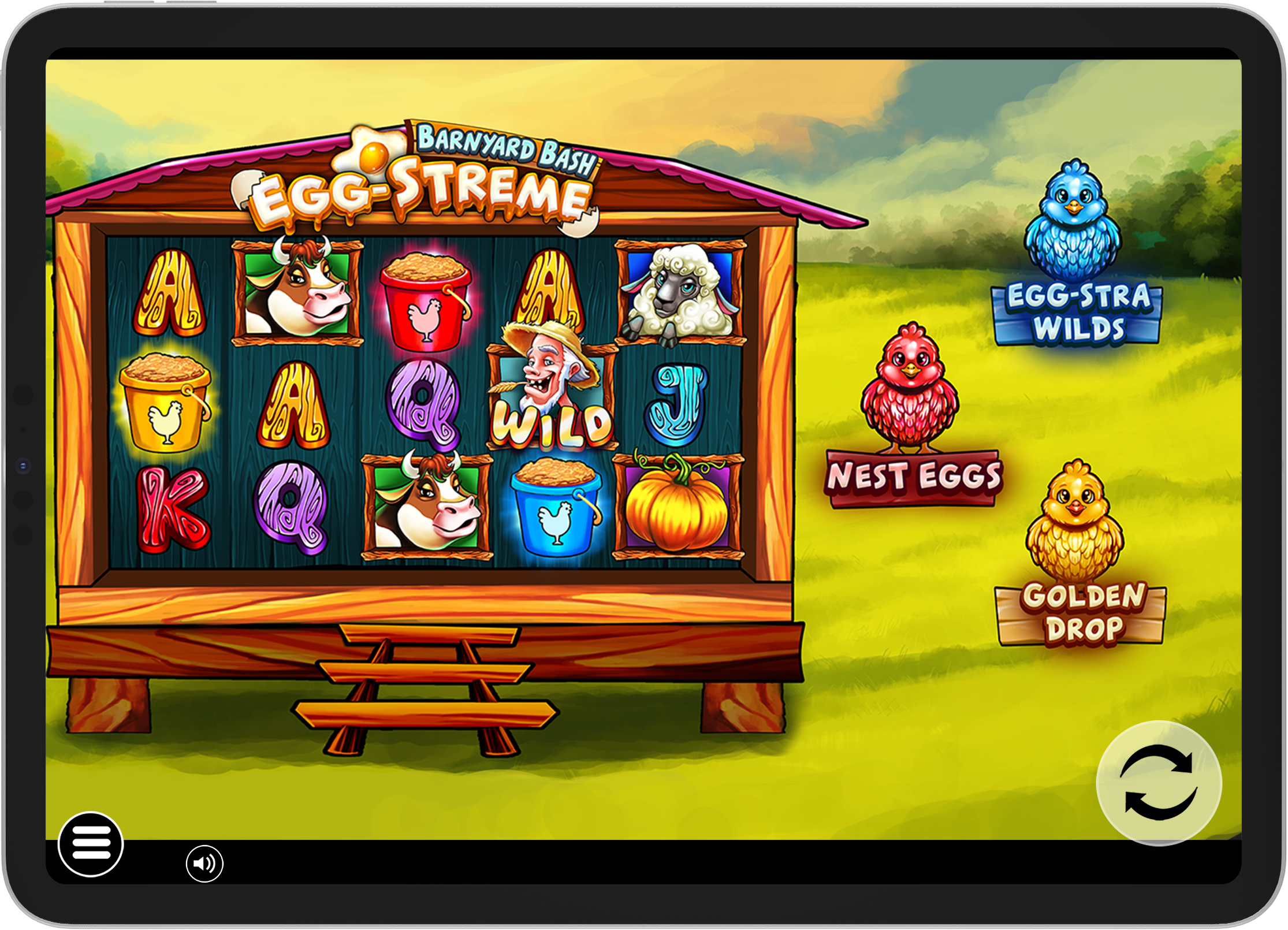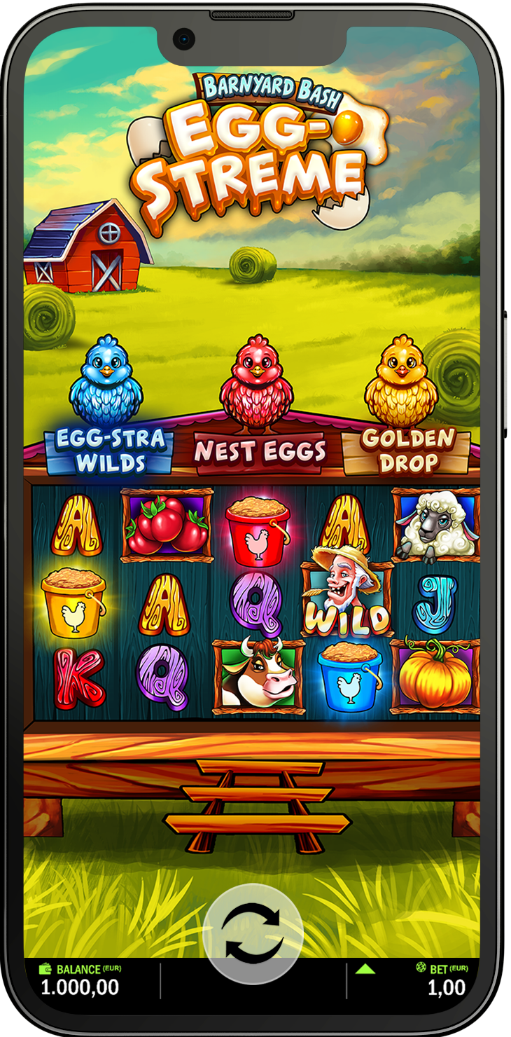 We are back on the farm and knee-deep in the clucking chaos! Every spin could crack open some egg-cellent wins! Keep feeding the chicks and they might just lay some egg-squisite features. Nest Eggs offers 15 eggs, pick to reveal a mystery prize up to the Mega Jackpot. Egg-stra WILDs will splat the reels with wild symbols, for huge win combinations. Golden Drop hatches cascading reel combinations and the possibility of a Mystery Egg prize!