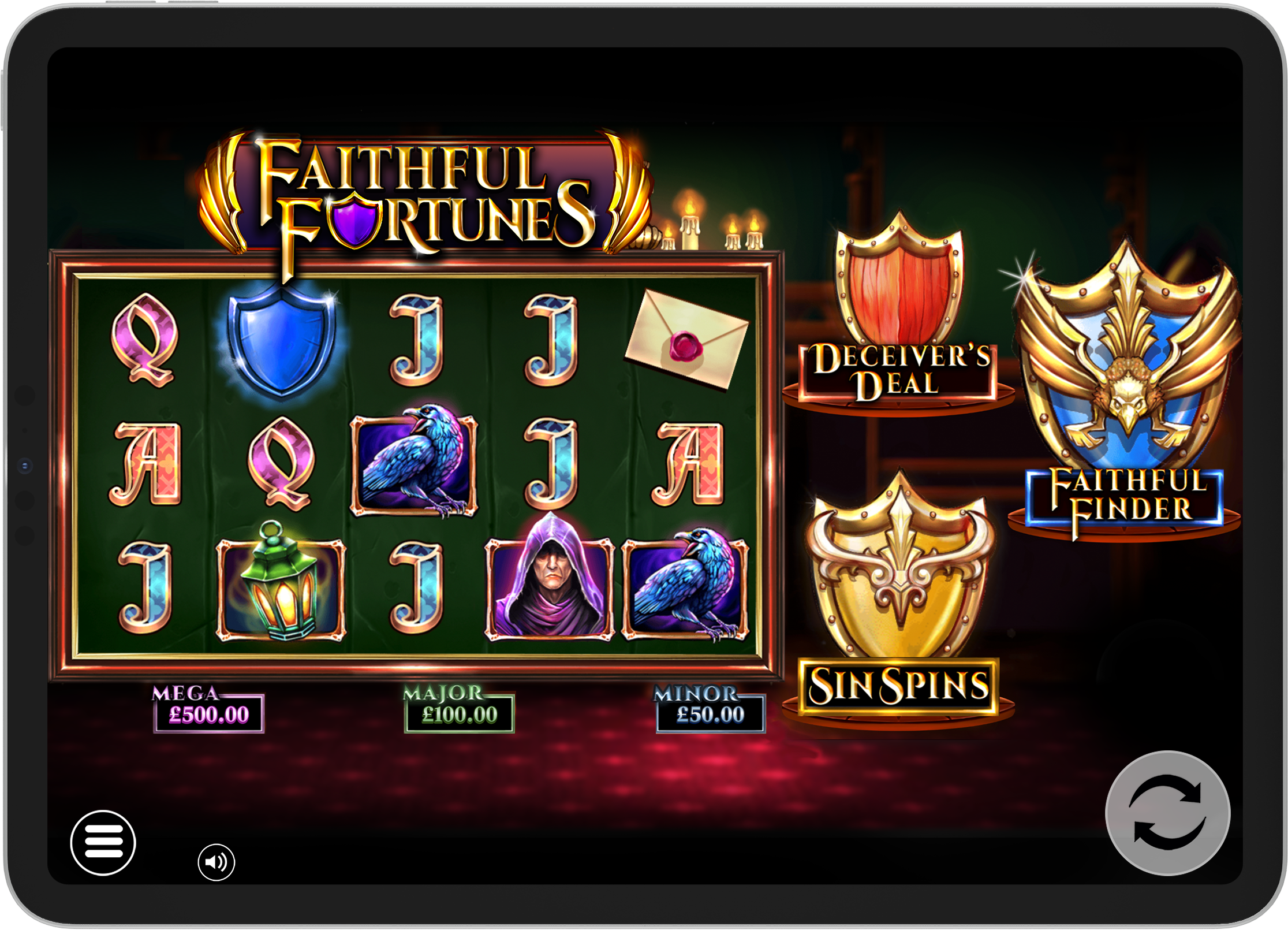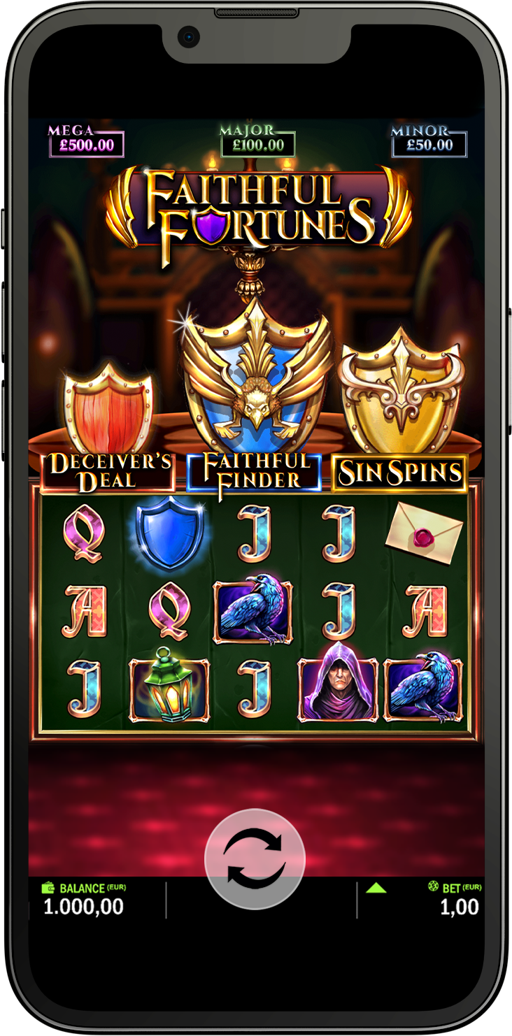 Oh faithful one! Step into the castle and take a seat at the round table in our latest release. With every spin, the power of the shields may be unleashed! Will you be rewarded with Faithful Finder? Pick from the cards, all hiding a mystery multiplier prize, until a Collect is revealed. Can you endure Sin Spins, loading the reels with extra WILD symbols and spinning until the minimum Sinning Wins occur! Or can you outwit the Deceiver’s Deal?