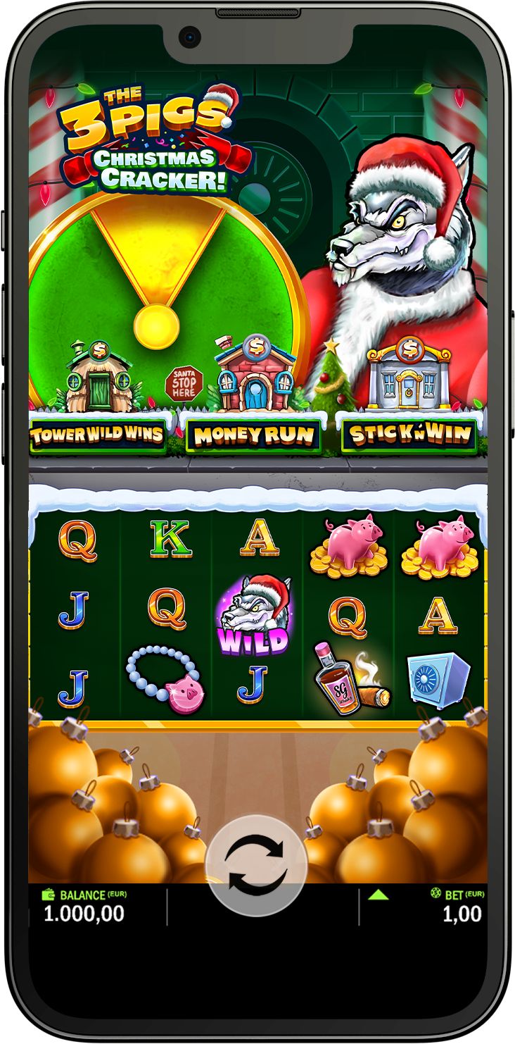 Watch out for the big bad wolf disguised in a Santa Suit in our festive celebration game: The 3 Pigs: Christmas Cracker! Gather the snow-capped building materials from the reels and grow the Piggies houses bigger and bigger. Once irresistible to the Wolf, in true Grinch-style he’ll blow them right down! Each house offers a unique feature when destroyed: Tower Wilds Free Spins, Money Run Free Spins and Stick ‘n’ Win. With each activation the Wolf gives you a chance to boost your feature for even bigger prizes, you’ll be howling with delight! Seasons greetings from S Gaming!
